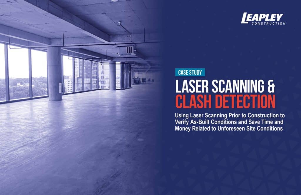 Leapley Construction partnered with Multivista to utilize laser scanning and AVVIR Inspect clash detection technology to verify existing conditions for a global financial technology company’s new two-floor office build-out. This technology provided accurate as-built information, determined systems layout, and prevented clashes through 3D modeling, saving the client an estimated $200,000* in redesign and change order issues.