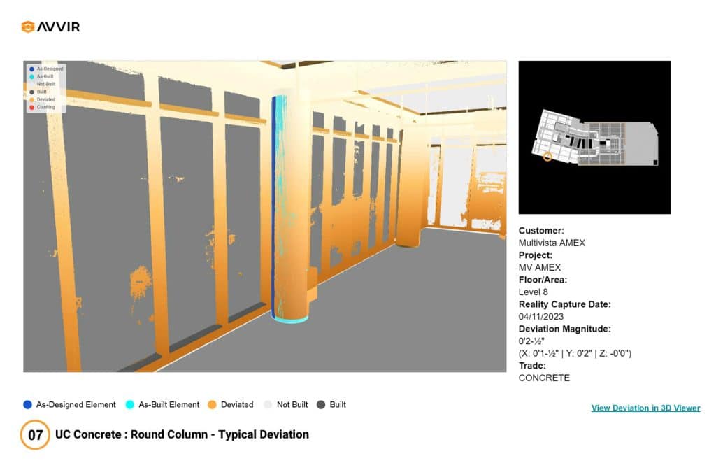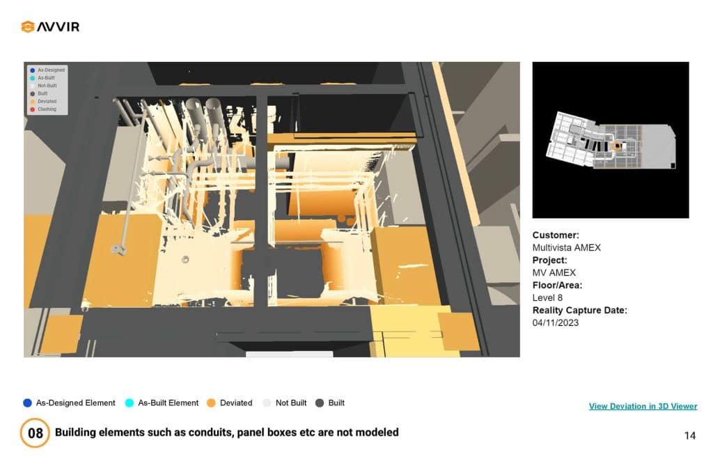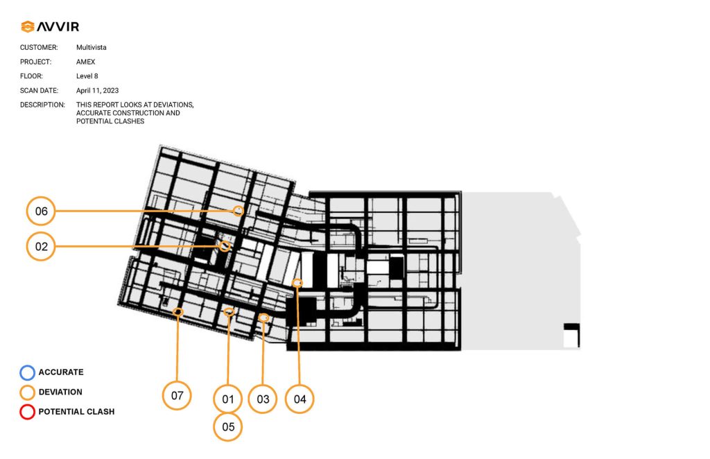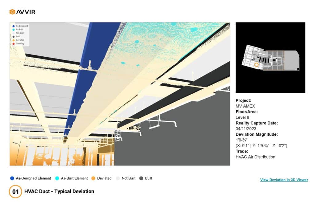 Leapley Construction proposed using Multivista and AVVIR technology to map in-wall and ceiling systems before construction to map existing conditions and validate the as-built model provided by the landlord. This proactive approach came after a previous client declined a similar proposal for a comparable first-generation project, which cost them $175,000 in change orders due to unforeseen conditions. In April 2023, Multivista scanned both floors, producing point-cloud data for comparison against the design model by AVVIR’s artificial intelligence-powered clash detection system. The scanning revealed significant deviations, including: